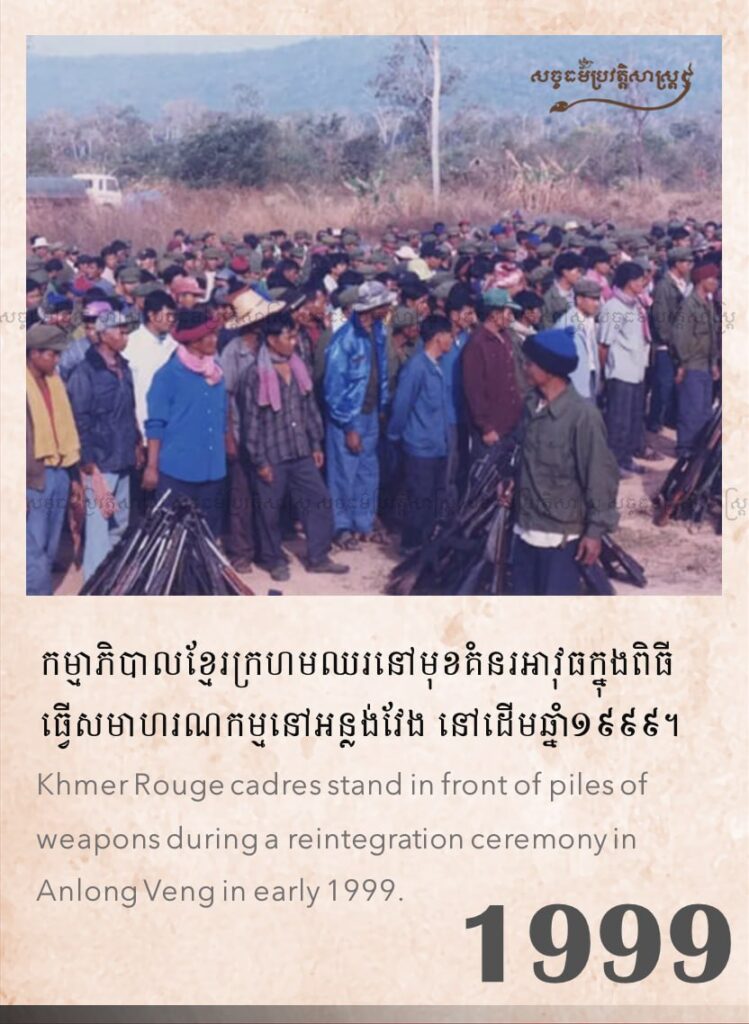 កម្មាភិបាលខ្មែរក្រហមឈរនៅមុខគំនរអាវុធក្នុងពិធីធ្វើសមាហរណកម្មនៅអន្លង់វែង នៅដើមឆ្នាំ១៩៩៩
