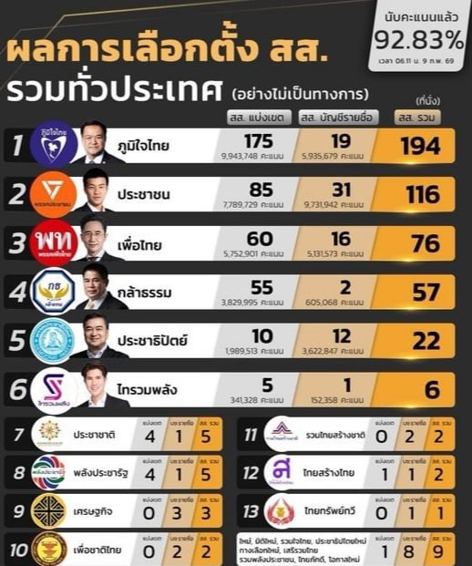 មេដឹកនាំគណបក្សភូមិចៃថៃរូបនេះ បាននាំមុខយ៉ាងដាច់ទៅលើគូប្រជែងសំខាន់ៗរបស់ខ្លួន មានដូចជា គណបក្សប្រជាជន (People’s Party) ដែលជាបក្សមាននិន្នាការចង់ធ្វើការផ្លាស់ប្តូរ និងរីកចម្រើន និងនាំមុខគណបក្សភឿថៃ (Pheu Thai) របស់ត្រកូល Shinawatra ដែលជាបក្សធ្លាប់មានប្រជាប្រិយភាពខ្លាំងតាមរយៈគោលនយោបាយបែបប្រជាភិថុត។