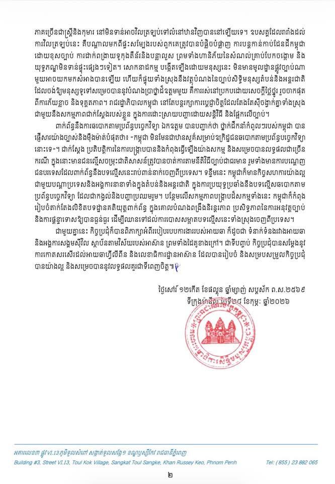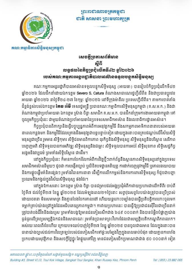 ក្នុងកិច្ចប្រជុំលើកទី៤២ ឆ្នាំ២០២៦ របស់គណៈកម្មការអន្តររដ្ឋាភិបាលអាស៊ានទទួលបន្ទុកសិទ្ធិមនុស្ស (អាយឆា) នាថ្ងៃទី២៤-២៧ ខែកុម្ភៈ ឆ្នាំ២០២៦ នៅទីក្រុងម៉ានីល ប្រទេសហ្វីលីពីន គណៈកម្មាធិការសិទ្ធិមនុស្សកម្ពុជា បានជម្រាបដល់អង្គប្រជុំអំពីការវាយប្រហារជាលើកទីពីររបសើយោធាថៃ ចាប់ពី ថ្ងៃទី៧ ដល់ថ្ងៃទី២៧ ខែធ្នូ ឆ្នាំ២០២៥ ដែលអំឡុងពេល២១ថ្ងៃនោះ សព្វាវុធសព្វបែបយ៉ាងត្រូវបានប្រើប្រាស់ ដោយចេតនា មិនសមាមាត្រ និងគ្មានបែងចែកគោលដៅ ហើយយន្តហោះចម្បាំងបានធ្វើប្រតិបត្តិការហោះចូលមកទម្លាក់គ្រាប់យ៉ាងជ្រៅក្នុងដែនអធិបតេយ្យភាពកម្ពុជា។ ការវាយប្រហារនេះ បានធ្វើឱ្យប្រជាជនស៊ីវិលជាច្រើននាក់ ត្រូវបាត់បង់ជីវិតនិងរងរបួស ព្រមទាំងបង្កឱ្យមានជនភៀសសឹកជាង ៦៤៩ ០០០នាក់ និងបានបំផ្លិចបំផ្លាញយ៉ាង ធ្ងន់ធ្ងរលើទ្រព្យសម្បត្តិឯកជននិងសាធារណៈ រួមទាំងប្រាសាទព្រះវិហារដែលជាសម្បត្តិបេតិកភណ្ឌពិភពលោក។ អស់រយៈពេលពីរខែហើយ ក្រោយបទឈប់បាញ់ថ្ងៃទី២៧ ខែធ្នូ ឆ្នាំ២០២៥ បានចូលជាធរមាន ដែលក្នុងនោះបាន ធានាយ៉ាងច្បាស់ដល់ការវិលត្រឡប់របស់ជនភៀសសឹកទៅផ្ទះសម្បែងវិញក្នុងពេលឆាប់បំផុត ដោយគ្មានការរារាំង ប្រកបដោយសុវត្ថិភាព និងសេចក្តីថ្លៃថ្នូរ តែផ្ទុយទៅវិញ មានជនភៀសសឹកប្រមាណជាជាង ៥០ ០០០នាក់ទៀត ភាគច្រើនជាស្ត្រីនិងកុមារ នៅមិនទាន់អាចវិលត្រឡប់ទៅលំនៅឋានវិញបាននៅឡើយទេ។ នេះបើយោងតាមសេចក្តីប្រកាសព័ត៌មានរបស់គណៈកម្មាធិការសិទ្ធិមនុស្សកម្ពុជា។