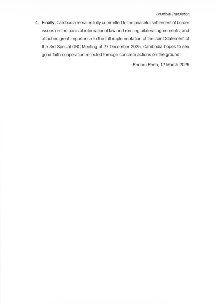៤. ជាចុងក្រោយ កម្ពុជានៅតែប្តេជ្ញាចិត្តយ៉ាងពេញលេញចំពោះដំណោះស្រាយបញ្ហាព្រំដែនដោយ សន្តិវិធីដោយផ្អែកលើច្បាប់អន្តរជាតិ និងកិច្ចព្រមព្រៀងទ្វេភាគីដែលមានស្រាប់ ហើយផ្តល់សារៈ សំខាន់យ៉ាងខ្លាំងចំពោះការអនុវត្តពេញលេញនៃសេចក្តីប្រកាសរួមនៃកិច្ចប្រជុំពិសេសលើកទី៣ របស់គណៈកម្មាធិការព្រំដែនទូទៅ ថ្ងៃទី២៧ ខែធ្នូ ឆ្នាំ២០២៥។ កម្ពុជាសង្ឃឹមថានឹងឃើញកិច្ចសហ ប្រតិបត្តិការប្រកបដោយភាពស្មោះត្រង់ ដែលឆ្លុះបញ្ចាំងតាម រយៈសកម្មភាពជាក់ស្តែង៕
