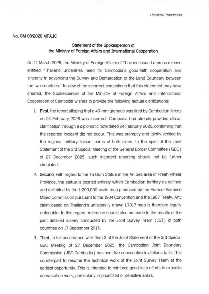 នៅថ្ងៃទី១១ ខែមីនា ឆ្នាំ២០២៦ ក្រសួងការបរទេសថៃ បានចេញសេចក្តីប្រកាសព័ត៌មានមួយដែលមាន ចំណងជើងថា “ប្រទេសថៃគូសបញ្ជាក់ពីតម្រូវការសម្រាប់កិច្ចសហប្រតិបត្តិការដោយស្មោះត្រង់របស់កម្ពុជា ក្នុងការជំរុញការងារវាស់វែង និងបោះបង្គោលព្រំដែនគោករវាងប្រទេសទាំងពីរ»។ ដោយយល់ឃើញថាសេចក្តីថ្លែងការណ៍ នេះអាចបង្កឱ្យមានការយល់ច្រឡំមួយចំនួន អ្នកនាំពាក្យក្រសួងការបរទេស និងសហប្រតិបត្តិការអន្តរជាតិកម្ពុជា សូមផ្តល់នូវការបំភ្លឺដូចខាងក្រោម៖