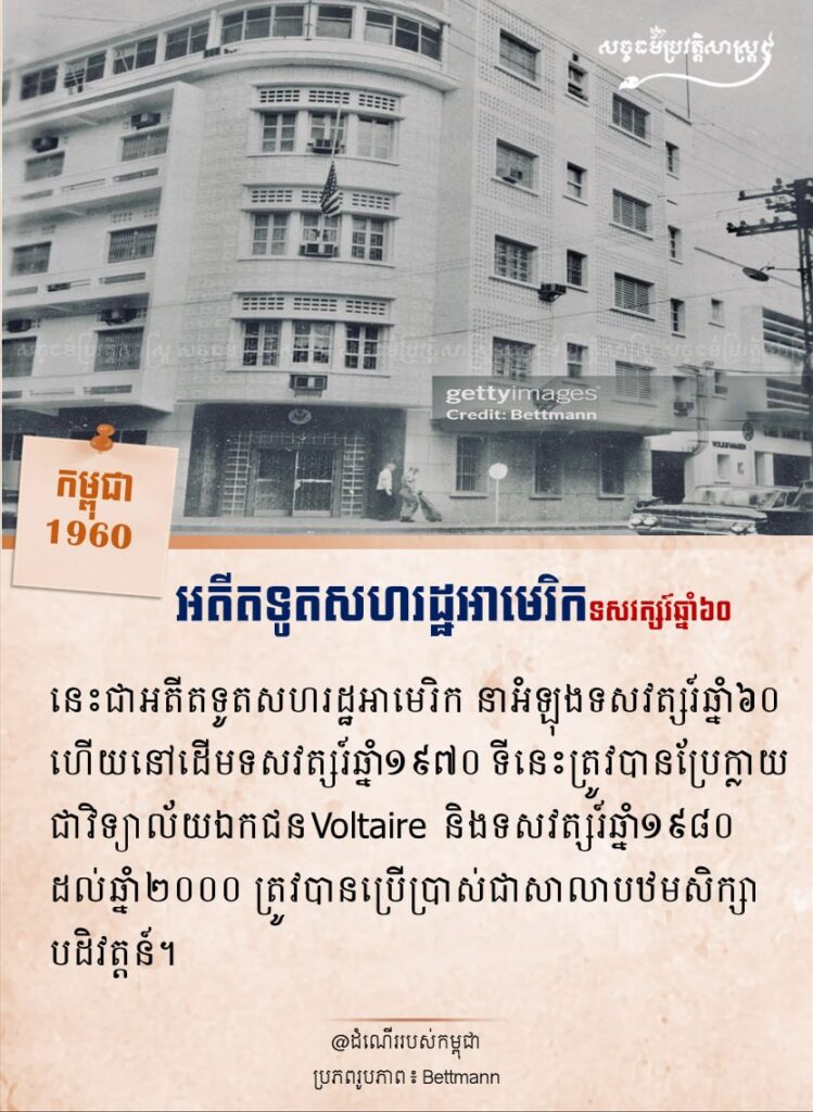 អតីតទូតសហរដ្ឋអាមេរិកទសវត្សរ៍ឆ្នាំ៦០ នេះជាអតីតទូតសហរដ្ឋអាមេរិក នាអំឡុងទសវត្សរ៍ឆ្នាំ៦០ ហើយនៅដើមទសវត្សរ៍ឆ្នាំ១៩៧០ ទីនេះត្រូវបានប្រែក្លាយជាវិទ្យាល័យឯកជនVoltaire និងទសវត្សរ៍ឆ្នាំ១៩៨០ ដល់ឆ្នាំ២០០០ ត្រូវបានប្រើប្រាស់ជាសាលាបឋមសិក្សាបដិវត្តន៍។