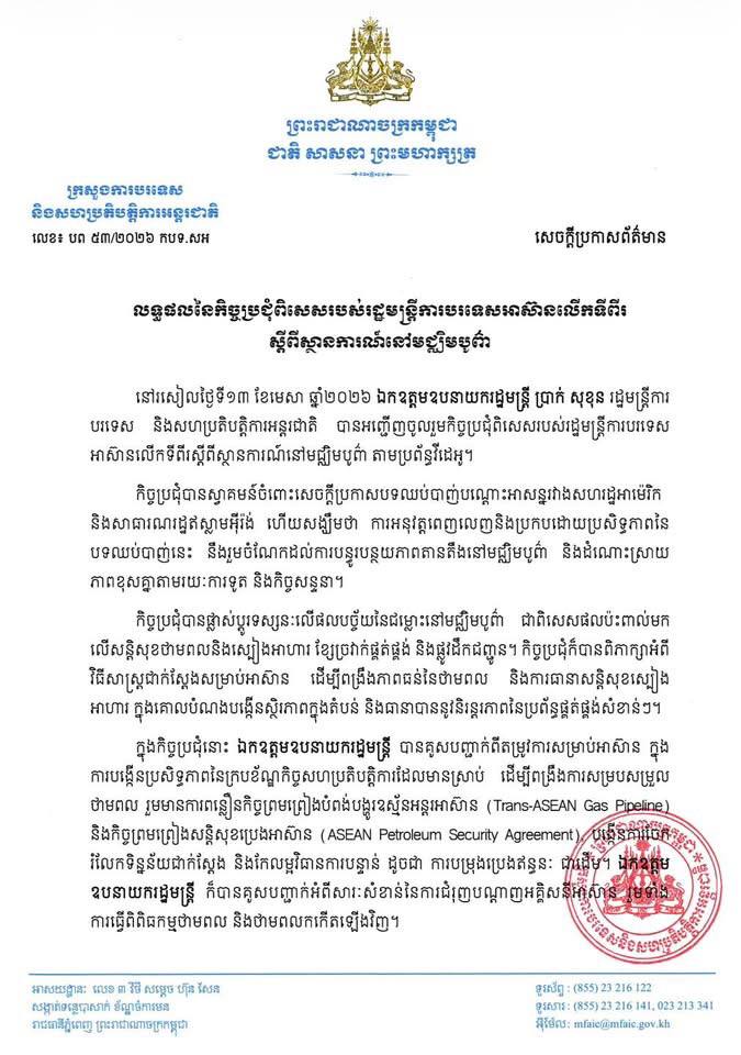 នៅរសៀលថ្ងៃទី១៣ ខែមេសា ឆ្នាំ២០២៦ ឯកឧត្តមឧបនាយករដ្ឋមន្ត្រី ប្រាក់ សុខុន រដ្ឋមន្ត្រីការបរទេសនិងសហប្រតិបត្តិការអន្តរជាតិ បានអញ្ជើញចូលរួមកិច្ចប្រជុំពិសេសរបស់រដ្ឋមន្ត្រីការបរទេស អាស៊ានលើកទីពីរស្តីពីស្ថានការណ៍នៅមជ្ឈិមបូព៌ា តាមប្រព័ន្ធវីដេអូ។