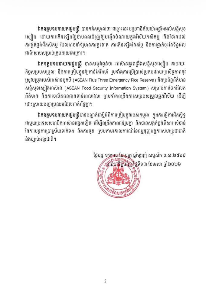 ឯកឧត្តមឧបនាយករដ្ឋមន្ត្រី បានសង្កត់ធ្ងន់ថា អាស៊ានគួរពង្រឹងសន្តិសុខស្បៀង តាមរយៈ កិច្ចសម្របសម្រួល និងការត្រៀមខ្លួនឱ្យកាន់តែរឹងមាំ រួមទាំងការប្រើប្រាស់ប្រកបដោយប្រសិទ្ធភាពនូវ ស្រូវបម្រុងរបស់អាស៊ានបូកបី (ASEAN Plus Three Emergency Rice Reserve) និងប្រព័ន្ធព័ត៌មាន សន្តិសុខស្បៀងអាស៊ាន (ASEAN Food Security Information System) សម្រាប់ការចែករំលែក ព័ត៌មាន និងការចល័តធនធានទាន់ពេលវេលា ព្រមទាំងពង្រឹងការសម្របសម្រួលឆ្លងវិស័យ ដើម្បី ដោះស្រាយបញ្ហាប្រឈមដែលពាក់ព័ន្ធគ្នា។