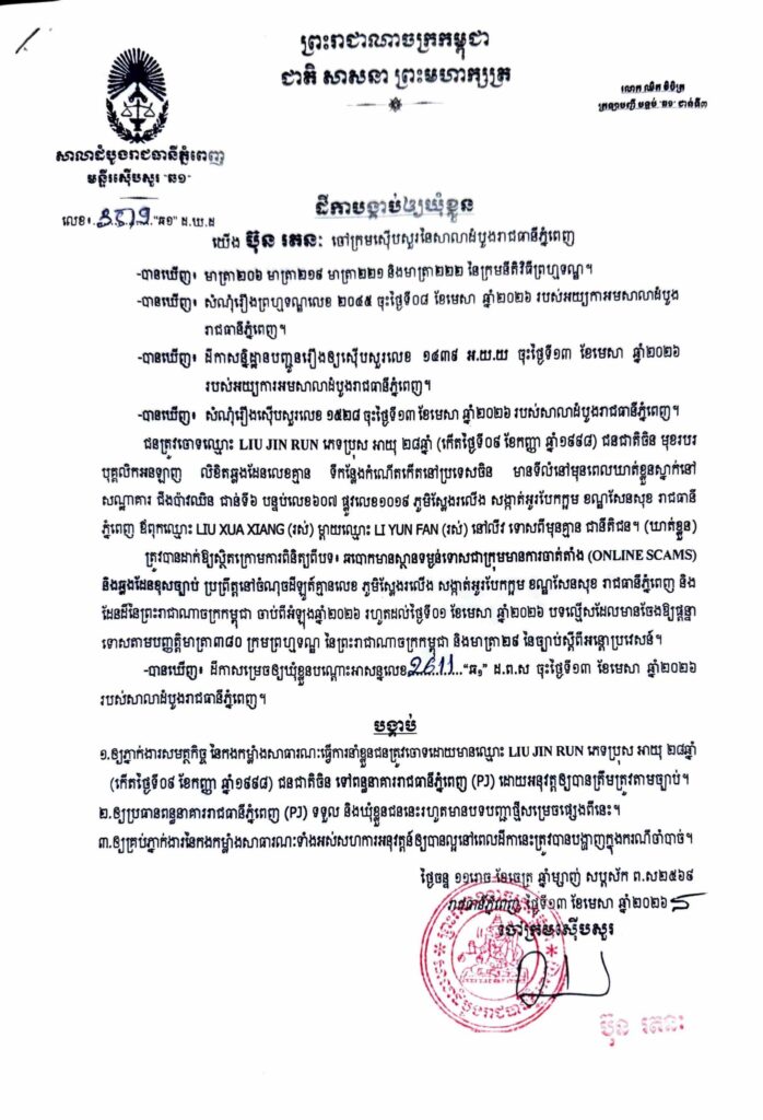 ភ្នំពេញ៖ចៅក្រមស៊ើបសួរសាលាដំបូងរាជធានីភ្នំពេញបានសម្រេច​ចោទប្រកាន់ជនត្រូវចោទជាចំនួន២០នាក់ (ស្រី្ត០២នាក់) ពីបទឆបោក​មានស្ថានទម្ងន់ទោសជាក្រុមមានការចាត់តាំង ការឆបោកតាមប្រព័ន្ធ​បច្ចេកវិទ្យា ((គ.ប.ឆ.ប. ) Online Scam )ទៅឃុំខ្លួនបណ្តោះ​អាសន្ននៅ​​ពន្ធនាគាររាជធានីភ្នំពេញ ។