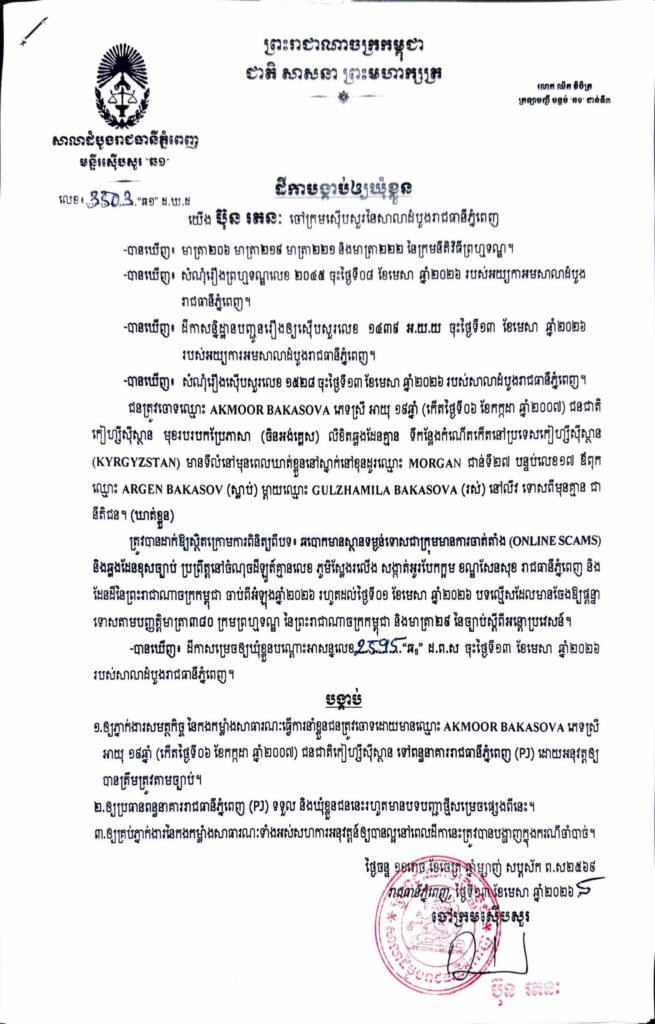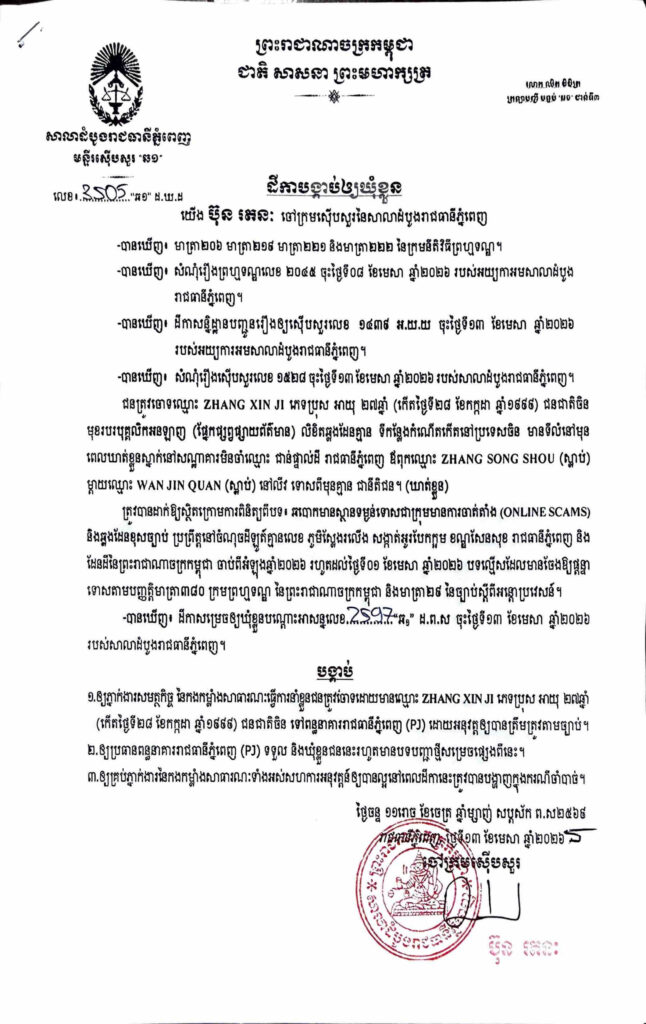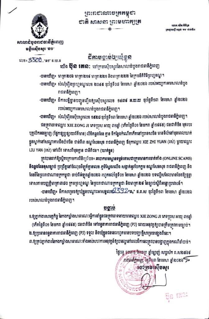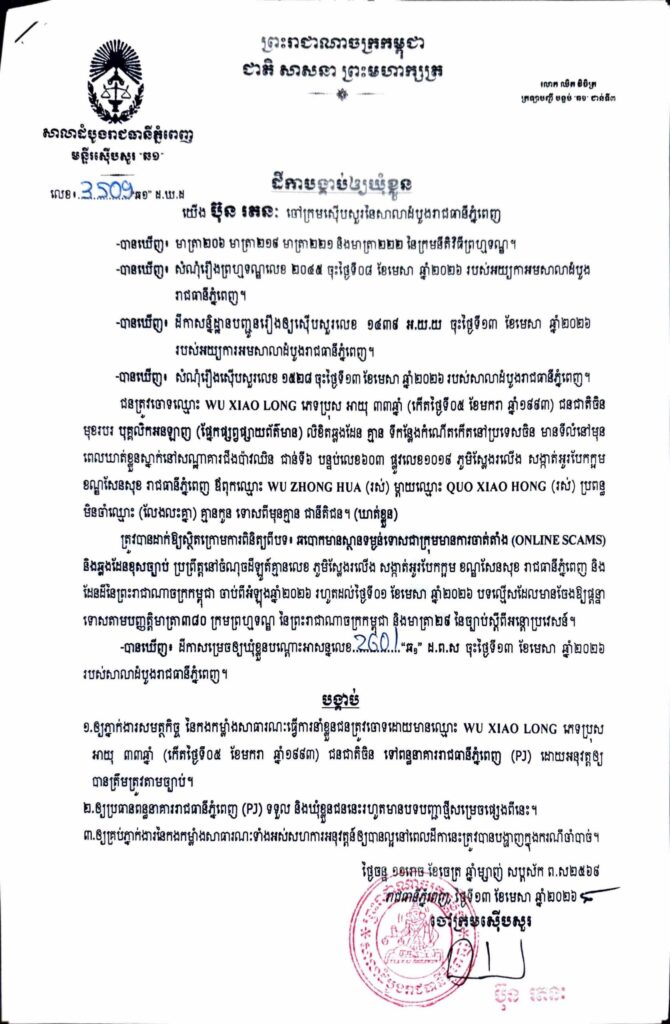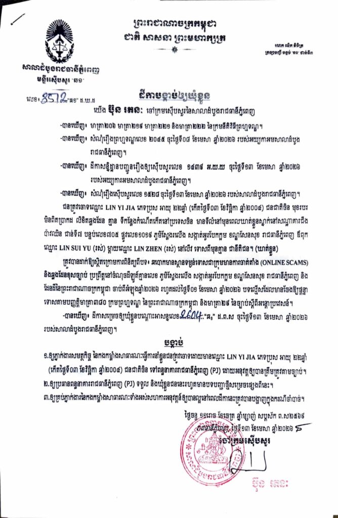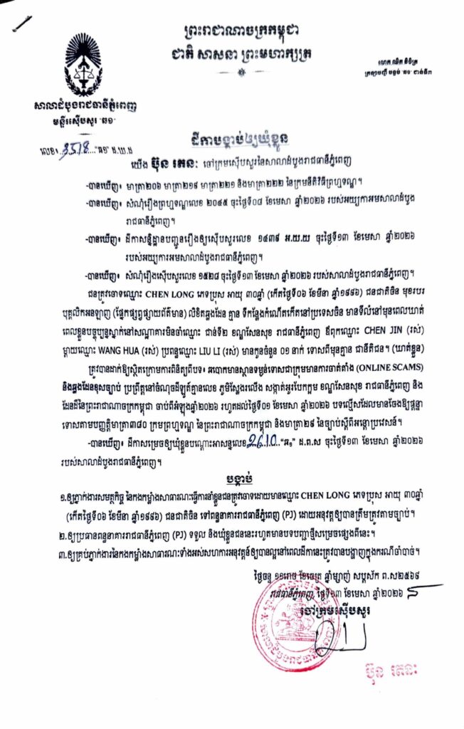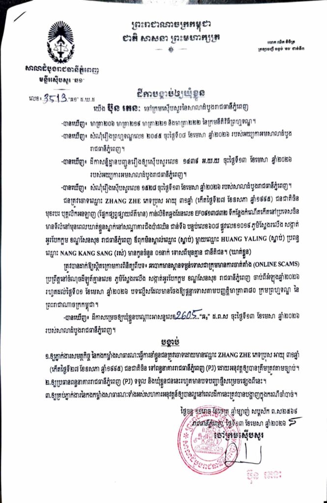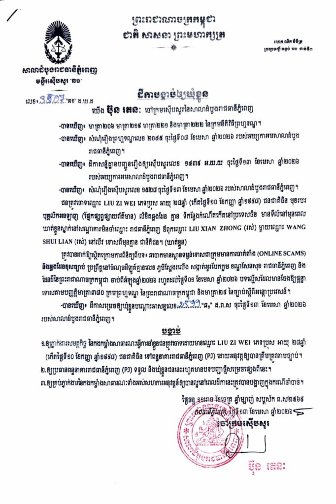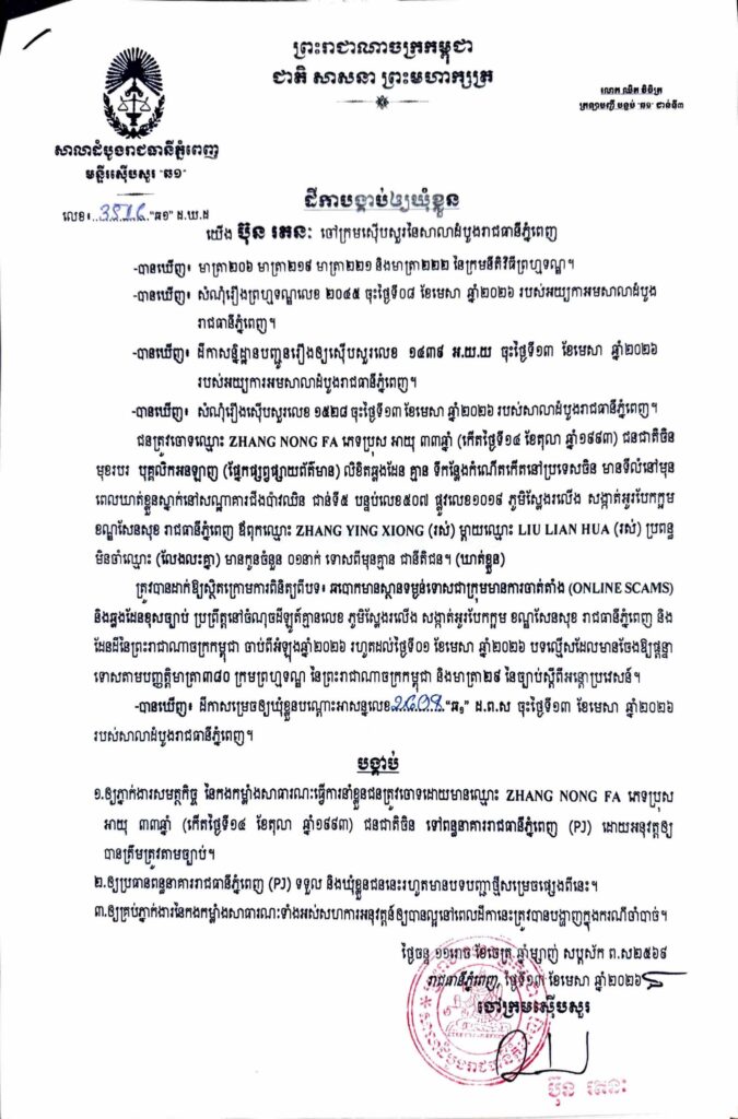 ប្រភពលេខាធិការដ្ឋានគណៈកម្មការចំពោះកិច្ចប្រយុទ្ធប្រឆាំងការឆបោកតាមប្រព័ន្ធបច្ចេកវិទ្យា (គ.ប.ឆ.ប.)បានឱ្យដឹងថា​យោង​តាមដីការ​បង្គាប់ឱ្យឃុំខ្លួនចំនួន២០ផ្សេងគ្នា ចេញដោយលោកប៊ុន រតនៈ ចៅក្រម​ស៊ើបសួរ នៃសាលាដំបូងរាជធានី​ភ្នំពេញ​កាលពី​ថ្ងៃទី១៣ ខែមេសា ឆ្នាំ២០២៦បានឱ្យដឹងថា ជនត្រូវជោទទាំង២០នាក់នោះមាន​ជនជាតិចិន១៩នាក់ និងជនជាតិកៀហ្សី​ស៊ីស្ថាន​ចំនួន១នាក់។