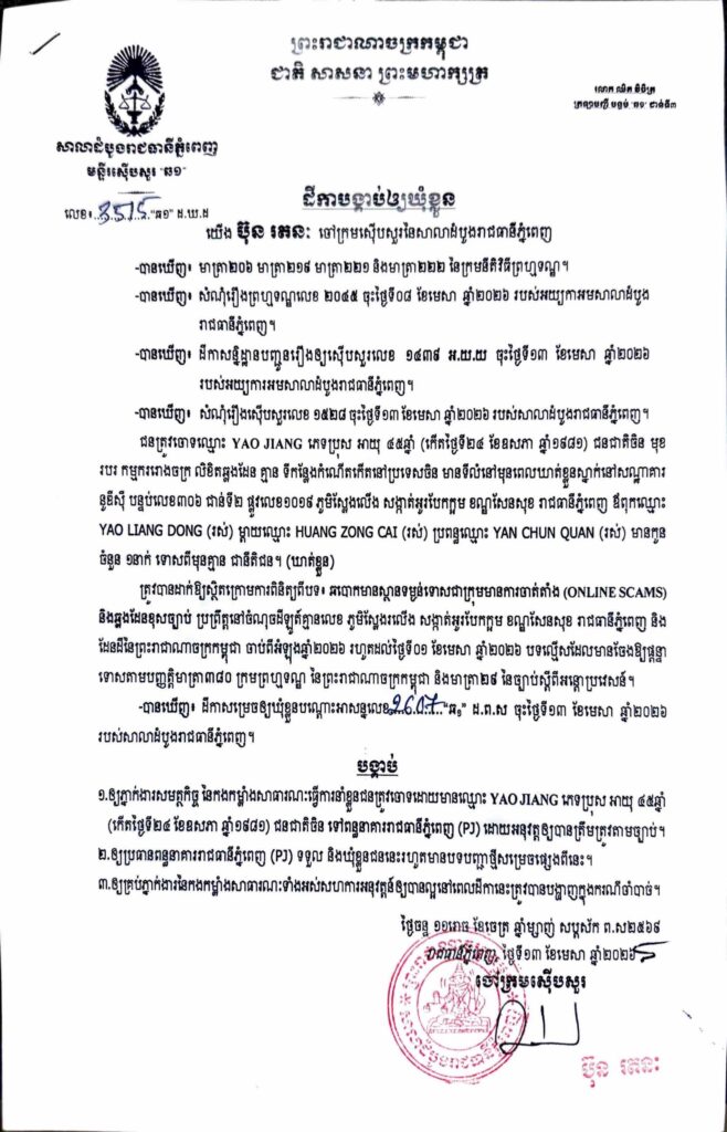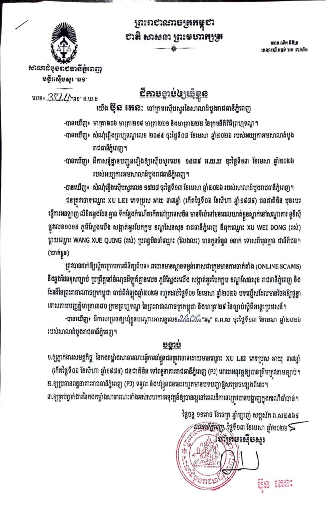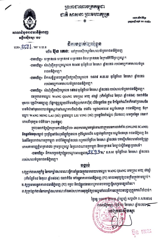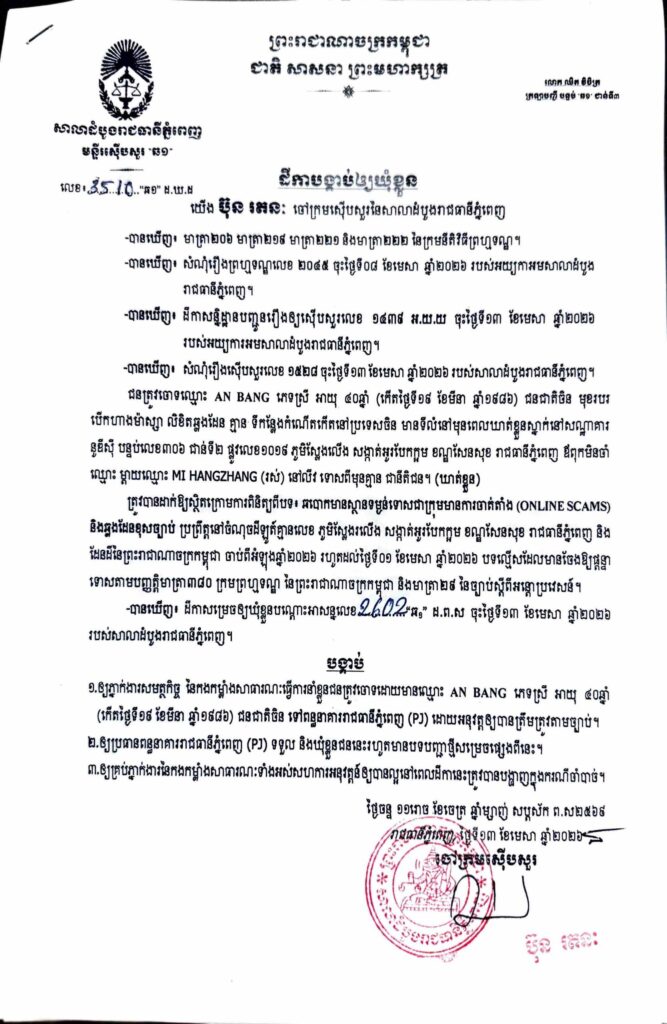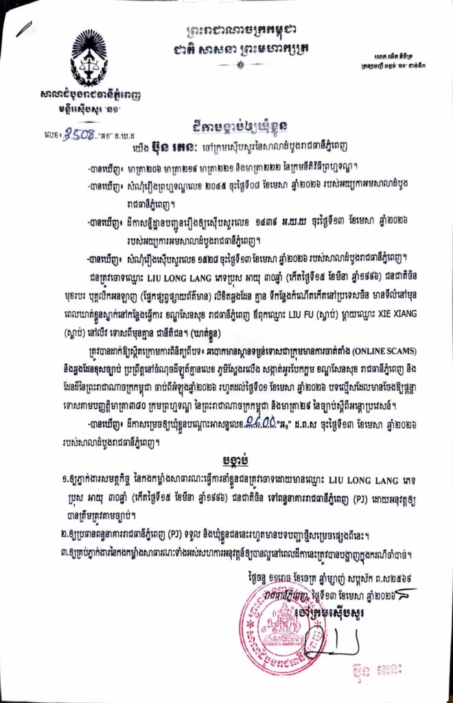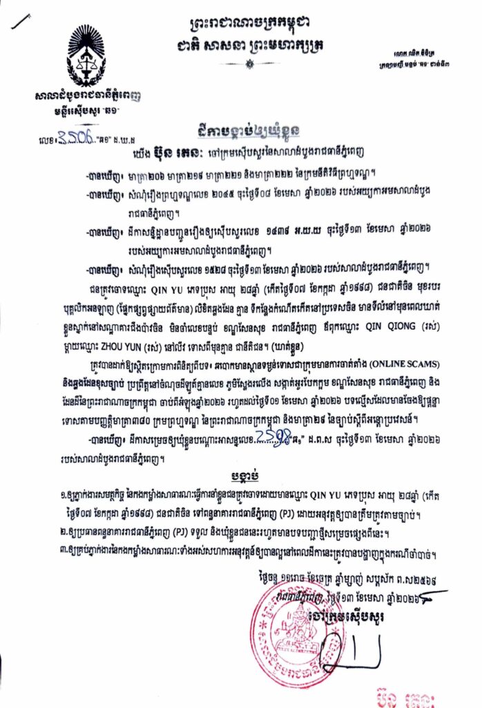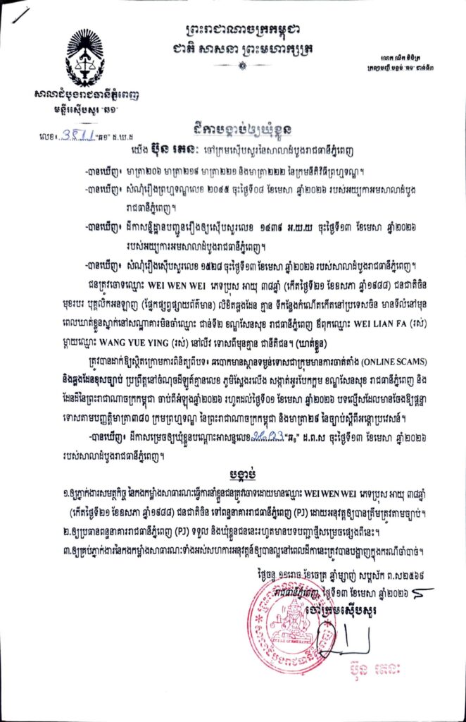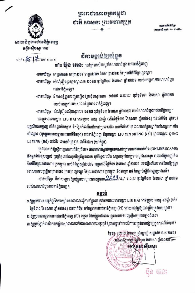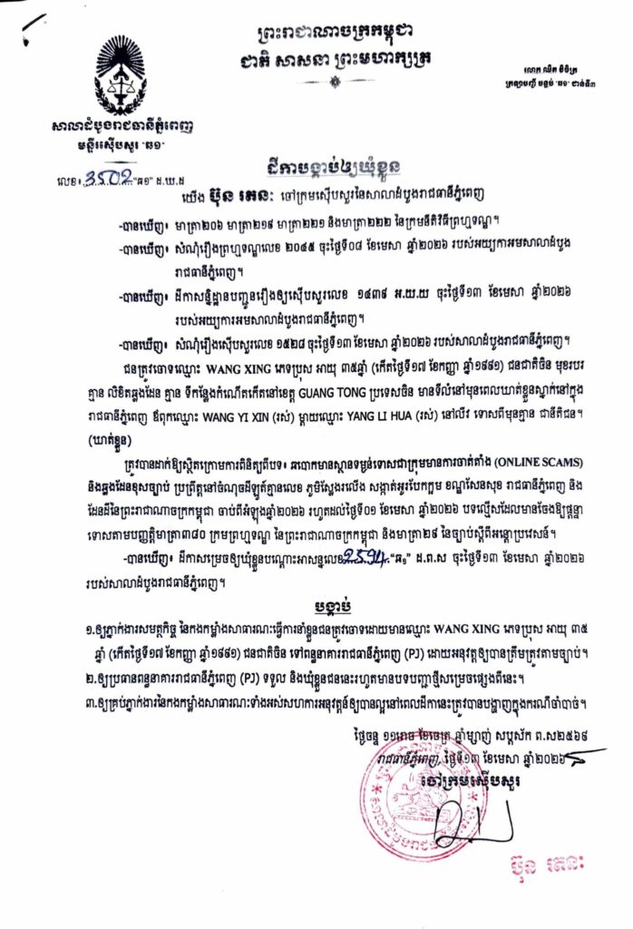 ប្រភពលេខាធិការដ្ឋានគណៈកម្មការចំពោះកិច្ចប្រយុទ្ធប្រឆាំងការឆបោកតាមប្រព័ន្ធបច្ចេកវិទ្យា (គ.ប.ឆ.ប.)បានឱ្យដឹងថា​យោង​តាមដីការ​បង្គាប់ឱ្យឃុំខ្លួនចំនួន២០ផ្សេងគ្នា ចេញដោយលោកប៊ុន រតនៈ ចៅក្រម​ស៊ើបសួរ នៃសាលាដំបូងរាជធានី​ភ្នំពេញ​កាលពី​ថ្ងៃទី១៣ ខែមេសា ឆ្នាំ២០២៦បានឱ្យដឹងថា ជនត្រូវជោទទាំង២០នាក់នោះមាន​ជនជាតិចិន១៩នាក់ និងជនជាតិកៀហ្សី​ស៊ីស្ថាន​ចំនួន១នាក់។