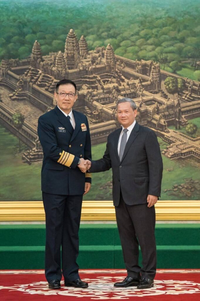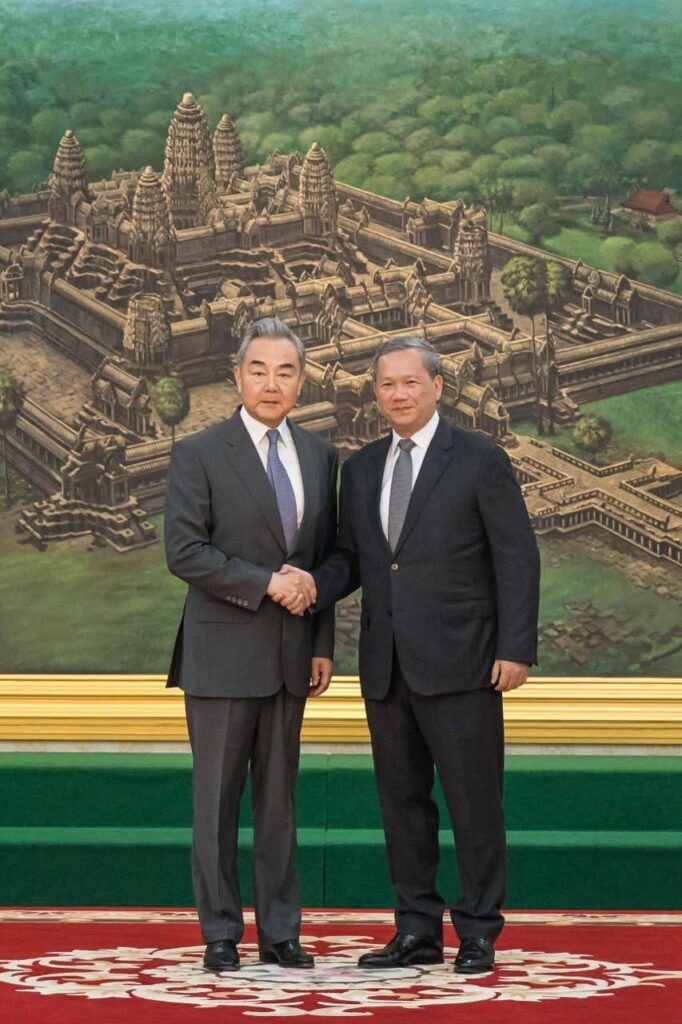 សម្ដេចមហាបវរធិបតី ហ៊ុន ម៉ាណែត នាយករដ្ឋមន្ត្រីនៃព្រះរាជាណាចក្រកម្ពុជា បានជាមួយឯកឧត្តម វ៉ាង យី (WANG Yi) រដ្ឋមន្ត្រីក្រសួងការបរទេស និងឯកឧត្តមនាយឧត្តមនាវី តុង ជុន (DONG Jun) រដ្ឋមន្ត្រីក្រសួងការពារជាតិ នៃសាធារណរដ្ឋប្រជាមានិតចិន នារសៀលថ្ងៃទី២២ ខែមេសា ឆ្នាំ២០២៦ នៅវិមានសន្តិភាព ក្នុងឱកាសដែលរដ្ឋមន្ត្រីចិនទាំងពីរអញ្ជើញចូលរួមធ្វើជាសហប្រធាននៃកិច្ចប្រជុំលើកទី១ នៃយន្តការកិច្ចសន្ទនាយុទ្ធសាស្ត្រ “២+២” ជាមួយរដ្ឋមន្ត្រីការបរទេស និងរដ្ឋមន្ត្រីការពារជាតិកម្ពុជា នៅរាជធានីភ្នំពេញ។