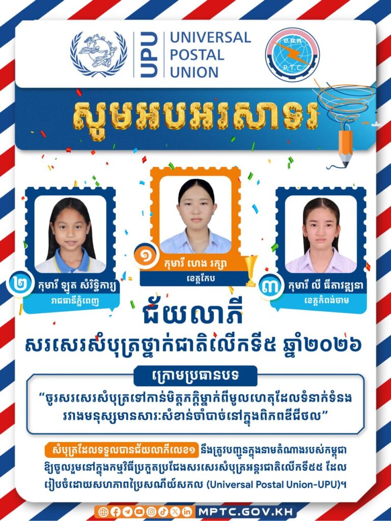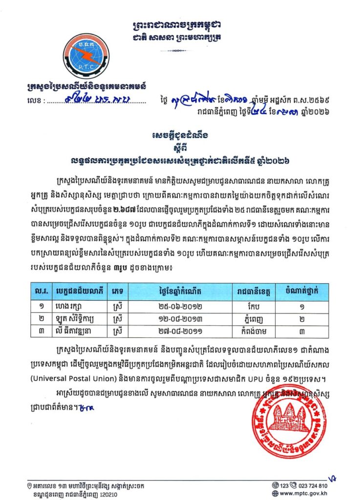 នេះបើយោងតាមសេចក្តីជូនដំណឹង របស់ក្រសួងប្រៃសណីយ៍និងទូរគមនាគមន៍ ស្តីពីលទ្ធផល នៃការប្រឡងប្រកួតប្រជែងសរសេរសំបុត្រថ្នាក់ជាតិលើកទី៥ ឆ្នាំ២០២៦