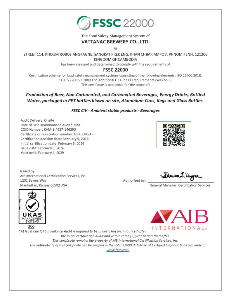 ទោះមានវត្តមានក្នុងទីផ្សារត្រឹមរយៈពេលខ្លី ក្រុមហ៊ុន វឌ្ឍនៈ តែងផ្តល់តម្លៃ និងយកចិត្តទុកដាក់ខ្ពស់បំផុតលើកត្តាគុណភាព សុវត្ថិភាពជាចម្បង ហើយថ្មីៗនេះ ក្រុមហ៊ុន វឌ្ឍនៈ បានទទួលវិញ្ញាបនបត្រ FSSC 22000 ហើយបានក្លាយជាក្រុមហ៊ុនក្នុងស្រុកដំបូងបំផុតក្នុងប្រទេសកម្ពុជាទទួលស្គាល់ដោយប្រព័ន្ធសុវត្ថិភាពចំណីអាហារពិភពលោកសម្រាប់ផលិតផលស្រាបៀរ ភេសជ្ជៈ និងទឹកពិសា។