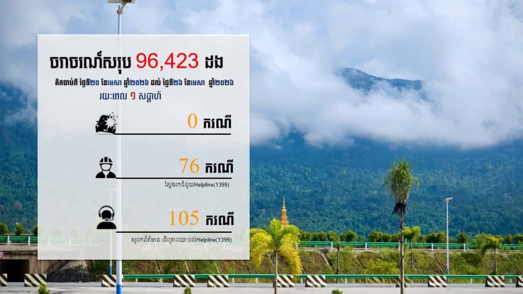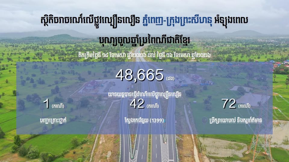 យោងតាមរបាយការណ៍លំហូរចរាចរណ៍ប្រចាំសប្តាហ៍ គិតចាប់ពីថ្ងៃទី ២០ ខែមេសា ​២០២៦ រហូតដល់ថ្ងៃទី​ ២៦ ខែមេសា ឆ្នាំ២០២៦ ចរាចរណ៍លើផ្លូវល្បឿនលឿនសរុបមានចំនួន ៩៦,៤២៣ដង ក្នុងមួយសប្តាហ៍ ដែលក្នុងនោះ មានការស្វែងរកជំនួយ​តាមទូរសព្ទសង្គ្រោះ ១៣៩៩ ចំនួន ១៨១ខ្សែ ស្វែងរកជំនួយចំនួន ៧៦ករណី និងប្រឹក្សាយោបល់សួរព័ត៌មានចំនួន ១០៥ ករណី និងគ្មានបញ្ហាគ្រោះថ្នាក់ចរាចរណ៍កើតឡើងទេ ។