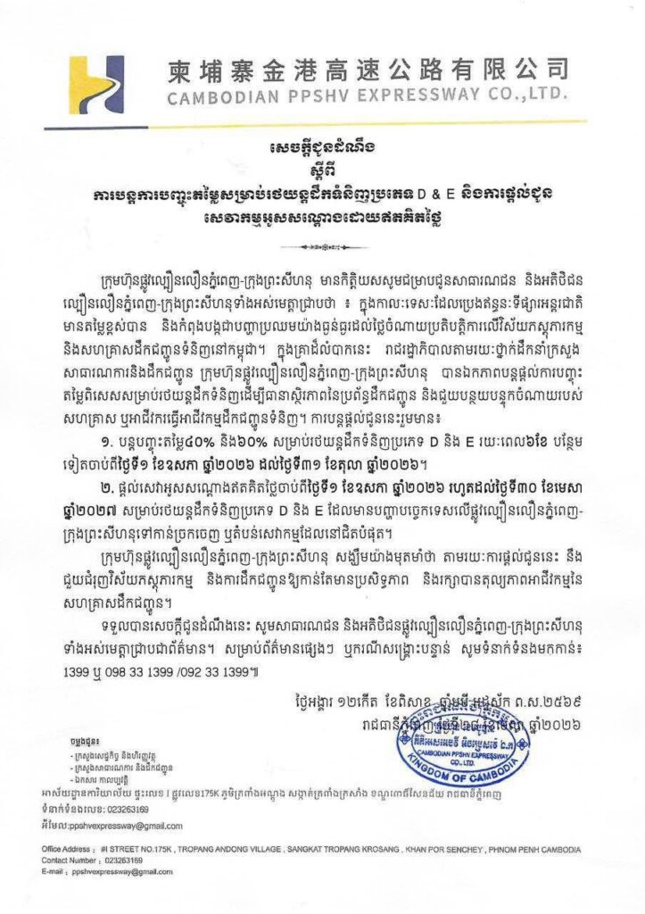 ក្នុងសេចក្តីជូនដំណឹងចុះថ្ងៃទី២៨ ខែមេសា ក្រុមហ៊ុនផ្លូវល្បឿនលឿនភ្នំពេញ-ក្រុងព្រះសីហនុ បានបញ្ជាក់ ថាក្នុងកាលៈ​ទេសៈ​ដែលប្រេងឥន្ធនៈទីផ្សារអន្តរជាតិ មានតម្លៃខ្ពស់បាន និងកំពុងបង្កជាបញ្ហាប្រឈមយ៉ាងធ្ងន់ធ្ងរ ដល់ថ្លៃចំណាយប្រតិបត្តិការ​លើវិស័យភស្តុភារកម្ម និងសហគ្រាសដឹកជញ្ជូនទំនិញនៅកម្ពុជា រាជរដ្ឋាភិបាលតាមរយៈថ្នាក់ដឹកនាំក្រសួង សាធារណការ និងដឹកជញ្ជូន ក្រុមហ៊ុនផ្លូវល្បឿនលឿនភ្នំពេញ-ក្រុងព្រះសីហនុ បានឯកភាពបន្តផ្តល់ការបញ្ចុះ តម្លៃពិសេសសម្រាប់រថយន្តដឹក​ទំនិញ ដើម្បីធានាស្ថិរភាព នៃប្រព័ន្ធដឹកជញ្ជូន និងជួយបន្ថយបន្ទុកចំណាយរបស់ សហគ្រាស ឬអាជីវករធ្វើអាជីវកម្មដឹក​ជញ្ជូនទំនិញ ។
