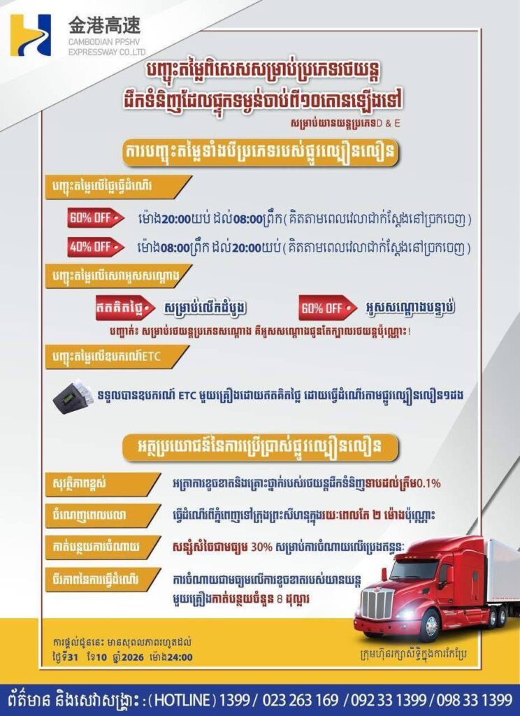 ភ្នំពេញ៖ ក្រុមហ៊ុនផ្លូវល្បឿនលឿនភ្នំពេញ-ព្រះសីហនុ បានប្រកាសពីការបន្តបញ្ចុះតម្លៃ សម្រាប់រថយន្តដឹកទំនិញប្រភេទ D & E និងការផ្តល់ជូនសេវាកម្មអូសសណ្តោងដោយឥតគិតថ្លៃ ដើម្បីរួមចំណែកបន្ថយការចំណាយប្រតិបត្តិការលើវិស័យភស្តុភារកម្ម និងសហគ្រាសដឹកជញ្ជូនទំនិញនៅកម្ពុជា ។