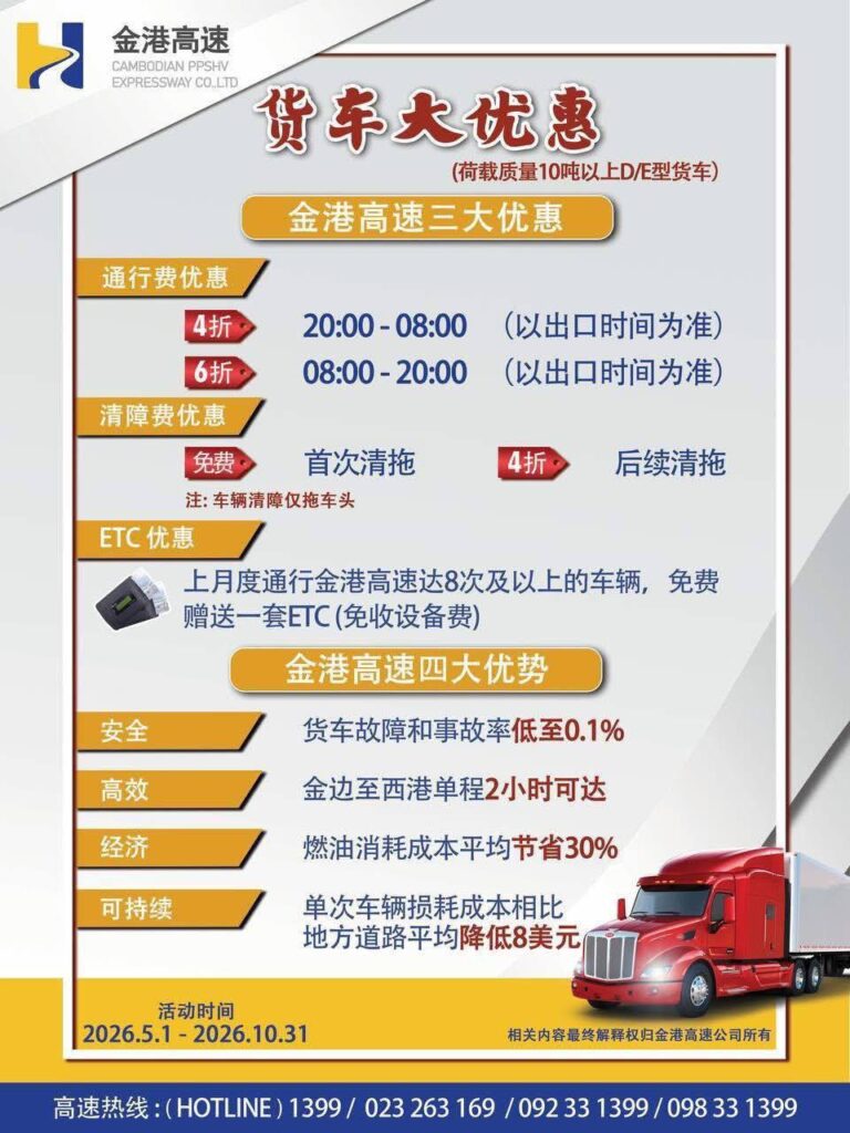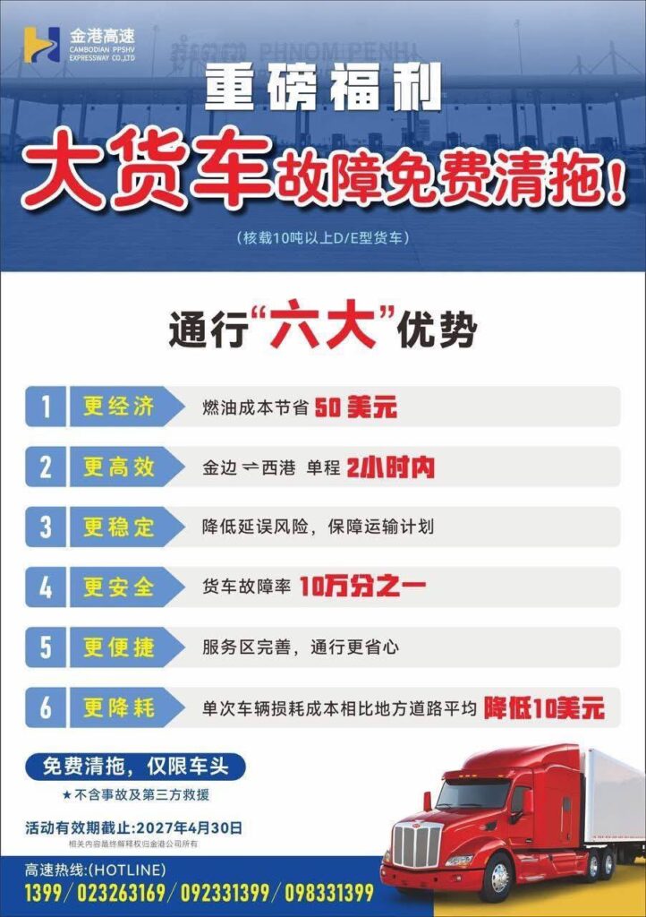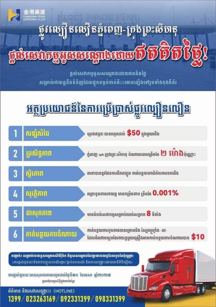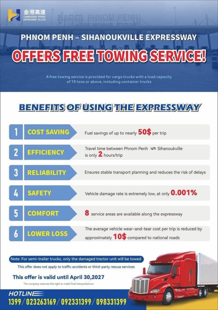 ក្រុមហ៊ុនផ្លូវល្បឿនលឿនភ្នំពេញ-ព្រះសីហនុ ប្រកាសបន្តបញ្ចុះតម្លៃសម្រាប់រថយន្តដឹកទំនិញប្រភេទ D & E និងការផ្តល់ជូន​សេវាកម្មអូសសណ្តោងឥតគិតថ្លៃ