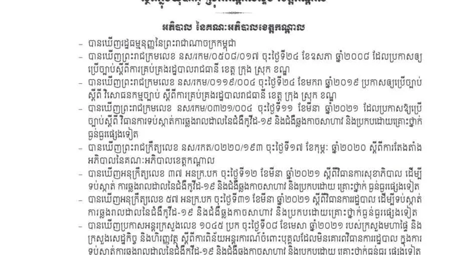 រដ្ឋបាលខេត្តកណ្ដាល ចេញសេចក្ដីសម្រេចស្តីពី ការផ្អាកដំណើរការអាជីវកម្មផ្សារកំពង់កន្ទួត ជាបណ្ដោះអាសន្ន ស្ថិតក្នុងឃុំបារគូ ស្រុកកណ្ដាលស្ទឹង ខេត្តកណ្ដាល រយៈពេល១៤ថ្ងៃ គិតចាប់ពីថ្ងៃទី០៦ ខែកក្កដា ឆ្នាំ២០២១ រហូតដល់ថ្ងៃទី១៩ ខែកក្កដា ឆ្នាំ២០២១។